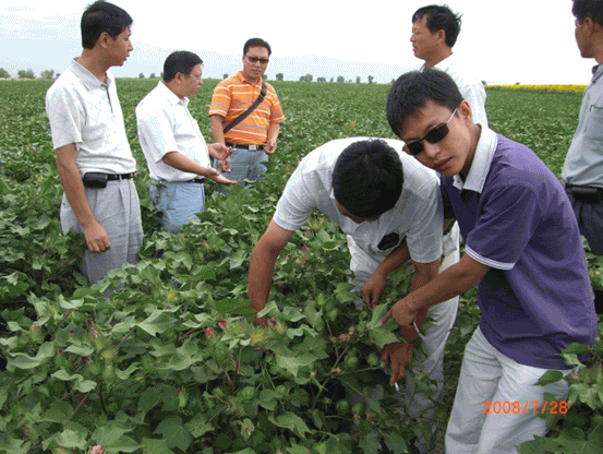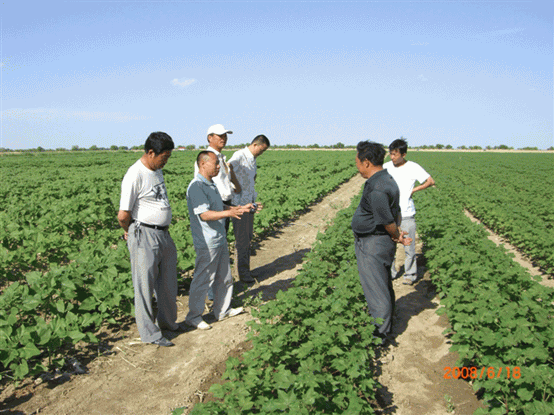 圖1:公司領(lǐng)導(dǎo)和技術(shù)員到地里察看棉苗長(zhǎng)勢(shì)