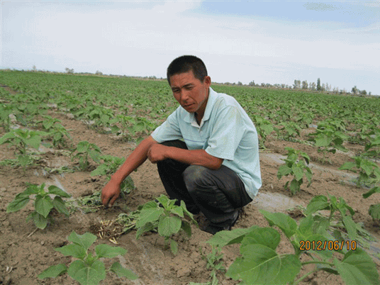 2012年,新疆阿勒泰地區(qū)科技特派員周琴視察“吉祥雨”復(fù)合微生物菌劑防治葵花列當(dāng)圖