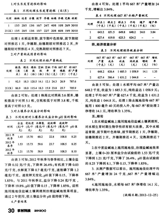 《農(nóng)村科技》2013年第4期 “施地佳”土壤鹽堿調(diào)理劑在鹽堿地水稻上的試驗
