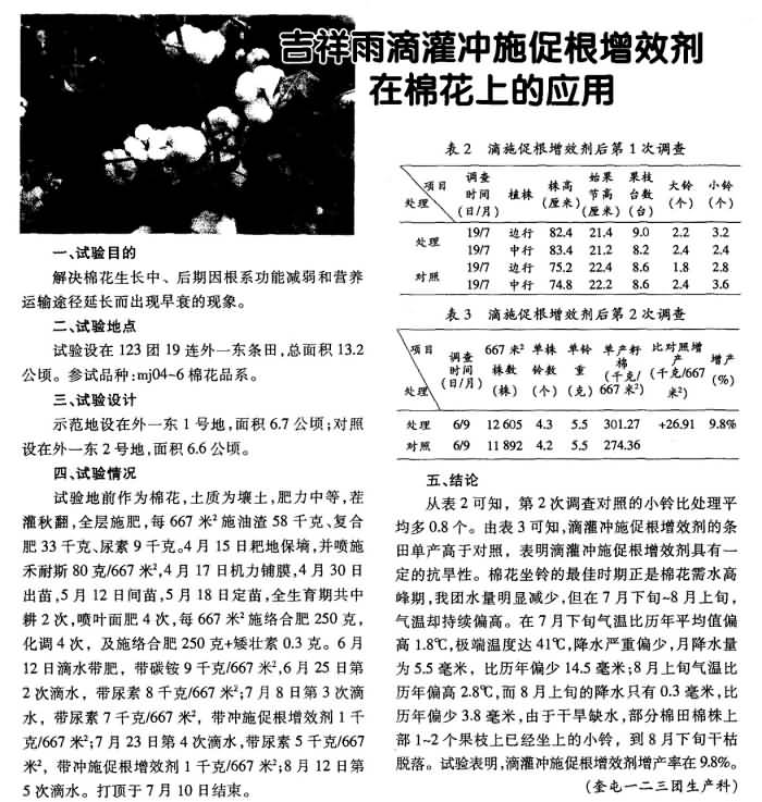 《農(nóng)村科技》2007年第4期 “吉祥雨”滴灌沖施促根增效劑在棉花上的應(yīng)用