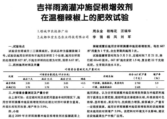 《農(nóng)村科技》2010年第11期 “吉祥雨”滴灌沖施促根增效劑在溫棚辣椒上的肥效試驗(yàn)
