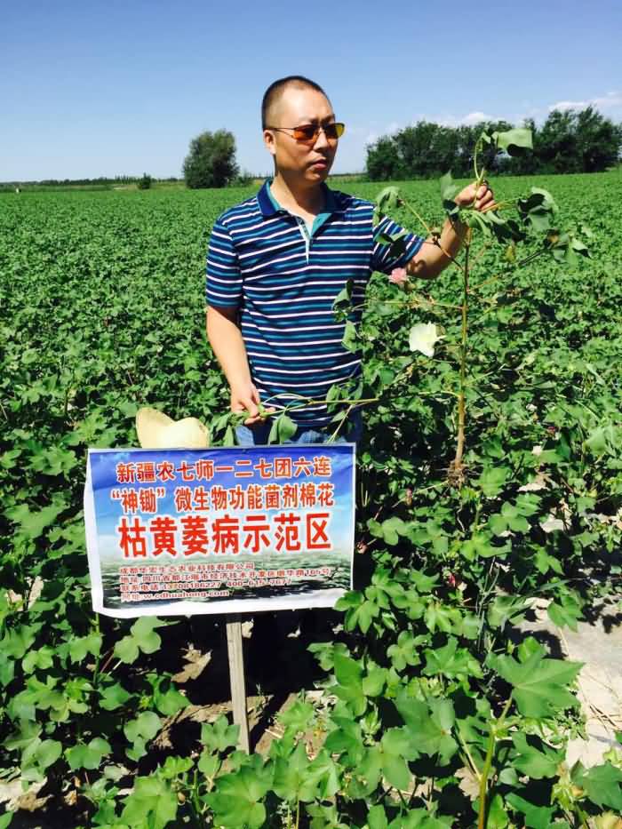新疆兵團(tuán)農(nóng)七師127團(tuán)是個(gè)老植棉團(tuán)場(chǎng),6連職工付躍發(fā)承包種植的290畝地更是該連棉花黃枯萎病發(fā)生最為嚴(yán)重的地塊。年初在該地簽承包合同時(shí),真是難為了連長(zhǎng)張玉海,土壤病菌多,無(wú)人承包,后來(lái)地是播下種了,苗出的也很整齊,可棉苗長(zhǎng)到20公分高時(shí)就開(kāi)始有黃枯萎病癥狀了。眼看就要進(jìn)頭水了,怎么辦呀?連隊(duì)干部們和付躍發(fā)急在心頭。