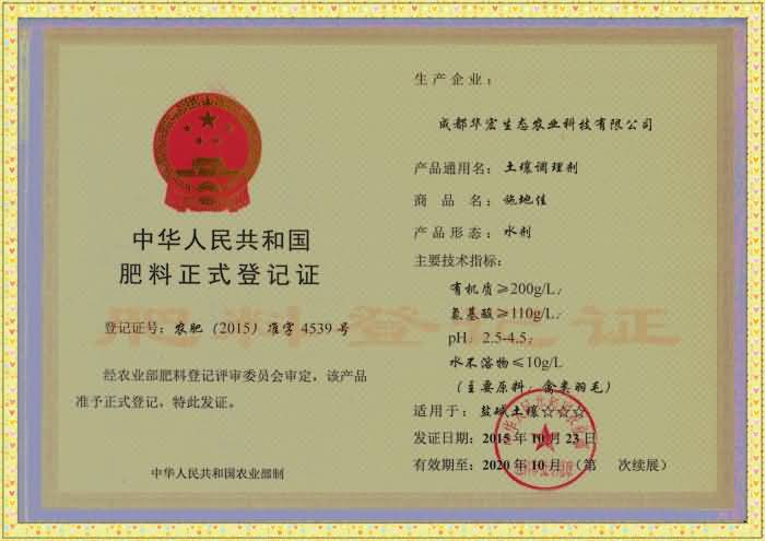 熱烈祝賀我公司“施地佳”土壤調(diào)理劑獲準農(nóng)業(yè)部正式登記 2015-11-15 華宏生物 熱烈祝賀我公司“施地佳”土壤調(diào)理劑獲準農(nóng)業(yè)部正式登記