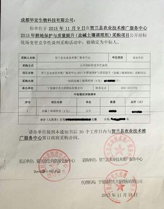 不久前,國內土壤調理劑產品研發(fā)生產先導型企業(yè)——成都華宏生態(tài)農業(yè)科技有限公司,收到了一份特別的通知書,“賀蘭縣政府采購”幾個大字分外顯眼,無不讓人感覺這份通知書的分量十足。筆者了解到,這是該企業(yè)參與賀蘭縣農業(yè)技術推廣服務中心“2015年鹽堿土壤調理劑采購項目”投標的中標通知書,該通知書的取得也意味著成都華宏在同類投標中連續(xù)四年中標,如此傲人的成績在業(yè)內還不多見。