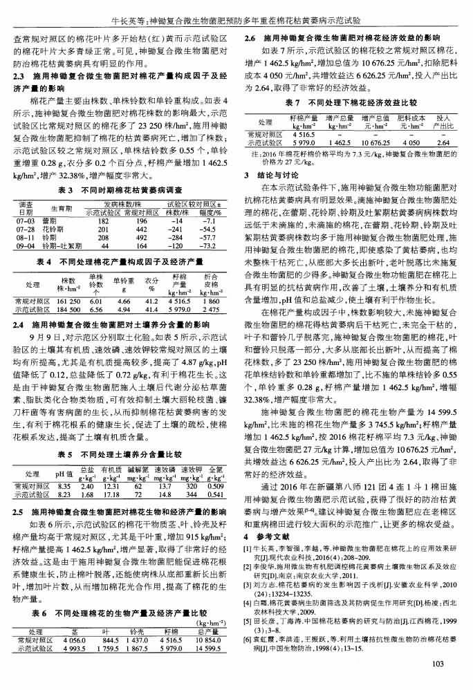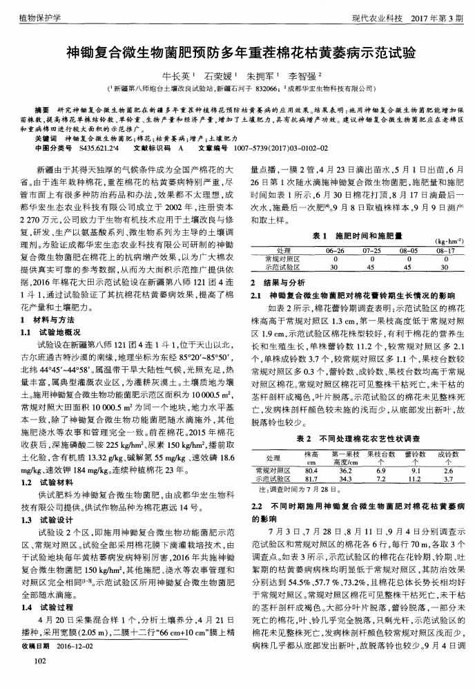 《現(xiàn)代農(nóng)業(yè)科技》2017年 第3期 神鋤復(fù)合微生物菌肥預(yù)防多年重茬棉花枯黃萎病示范試驗