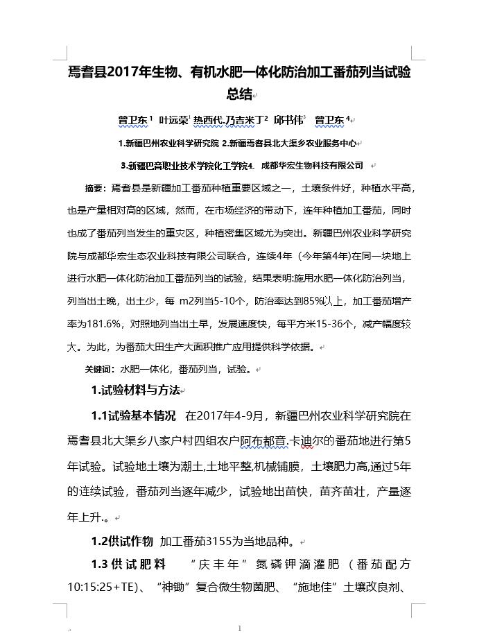 焉耆縣2017年生物、有機水肥一體化防治加工番茄列當試驗總結