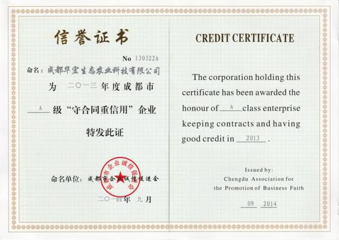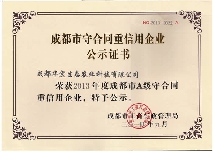 我公司榮獲2013年度成都市A級(jí)“守合同、重信用”企業(yè)榮譽(yù) 2014/11/8 華宏生物 成都華宏生態(tài)農(nóng)業(yè)科技有限公司 榮獲2013年度成都市“守合同、重信用”A級(jí)企業(yè)榮譽(yù) 公示證書(shū) 榮譽(yù)證書(shū)